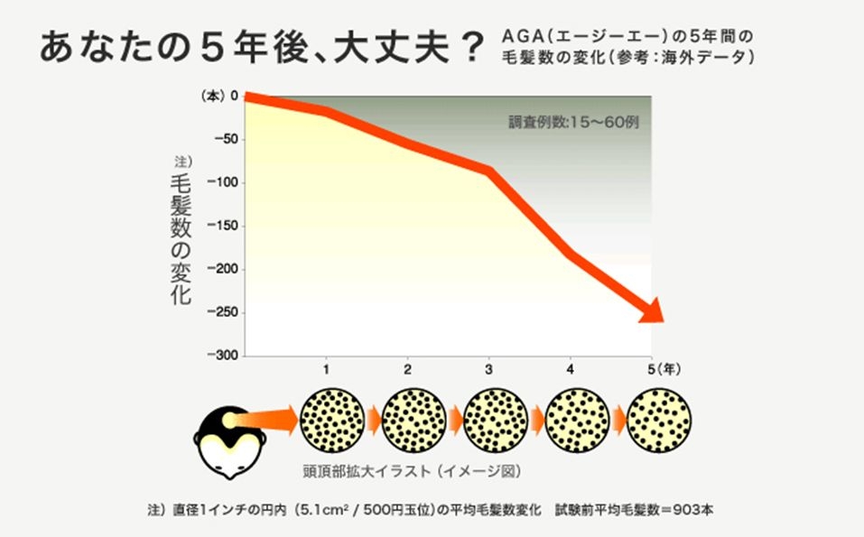 男性型脱毛症(AGA)は進行性が強い症状ですので、自己ケアだけで、正しいケアが出来ていないと、下記のグラフのように髪の毛は減り続け、徐々に薄くなっていきます。